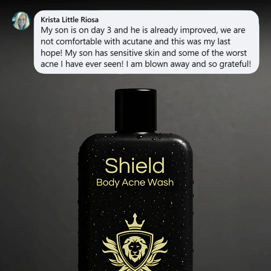 Clear stubborn back, chest, and shoulders acne in just 2-6 weeks. With dermatologist-approved ingredients and free from harsh chemicals, Shield Body Wash is gentle on sensitive skin.